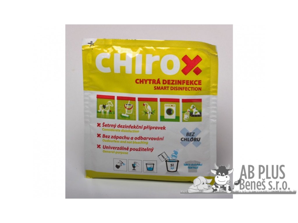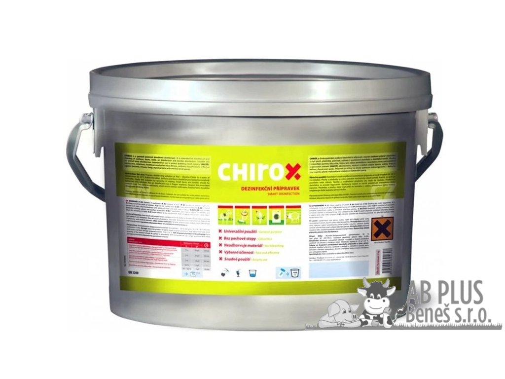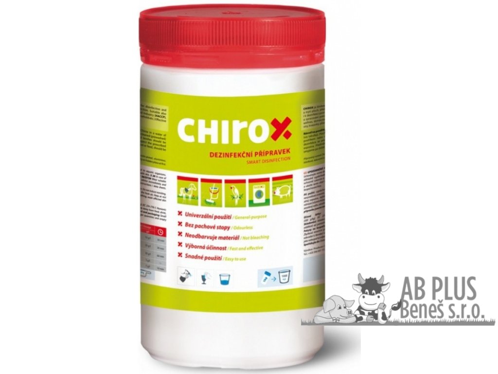 Chirox je výborným pomocníkem všude tam, kde je potřebné umýt a současně dezinfikovat velké plochy. Roztok se aplikuje jak pomocí otěru (vytíráním), tak pomocí postřiku (vysokotlakým čištěním). Je vhodný k dezinfekci ploch v místnostech, chodbách, halách, stájích pro zvířata apod. Při používání nezapáchá, nepoškozuje zdraví přítomných lidí ani zvířat nepříjemnými výpary. Roztok je bezbarvý a nezabarvuje ošetřované materiály.