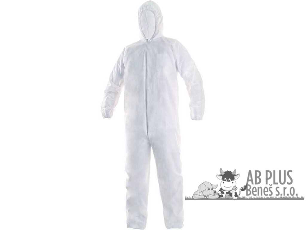 Jednorázový oblek CXS OVERAL z netkané textílie. Oblek se zapíná na zip. Kapuce, manžety rukávů a nohavice jsou zakončeny gumičkou. Chrání před prachem a lehkým zašpiněním. Doporučené použití: potravinářství, kosmetika, zdravotnická zařízení, kde není požadavek na sterilní oděv. EN ISO 13688.